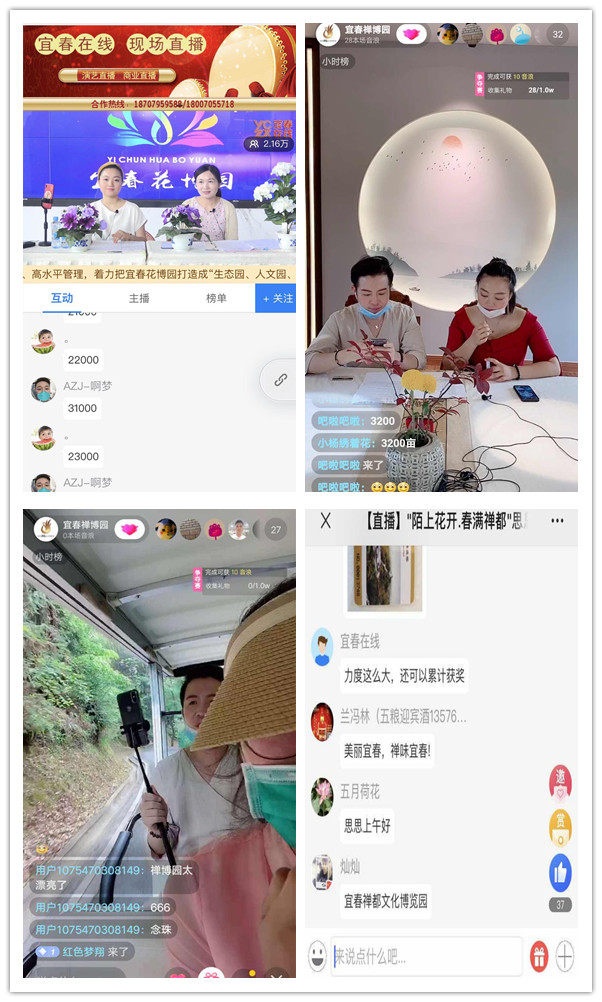 為加大宣傳推廣,“五一”小長假假期,我司利用宜春在線、禪博園、花博園抖音等網(wǎng)絡(luò)平臺,開展直播宣傳營銷。5月1、2日兩園以“陌上花開.春滿禪都”和“植物世界,花藥魔法”為主題,共計(jì)開展了4場次游園直播和直播間直播。直播主播們詳細(xì)地向網(wǎng)友們介紹了兩園的景點(diǎn),并不時(shí)開展答題搶年卡活動,網(wǎng)友們積極互動,踴躍答題,參與直播的互動人數(shù)達(dá)到5.74萬人次。