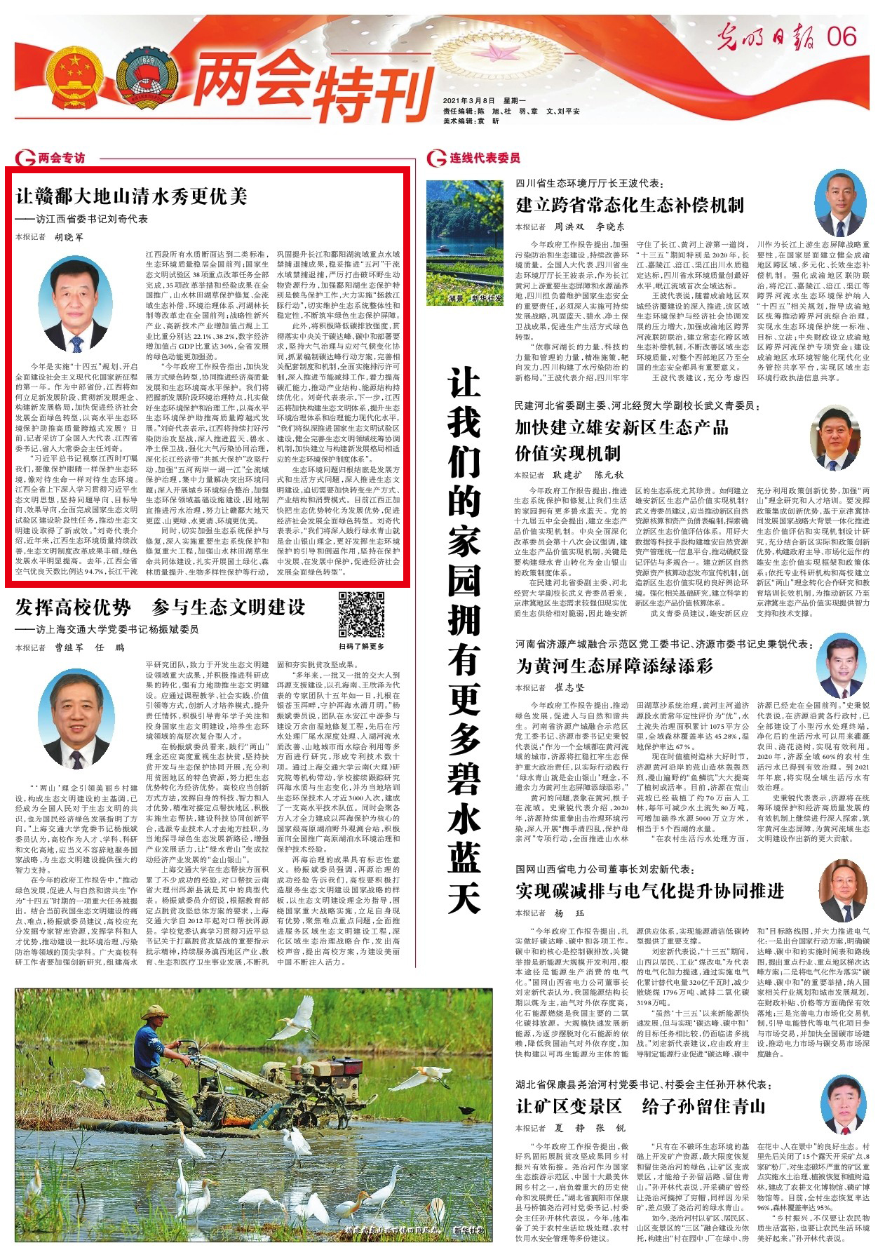 此外,將積極降低碳排放強度,貫徹落實中央關(guān)于碳達峰、碳中和部署要求,堅持大氣治理與應對氣候變化協(xié)同,抓緊編制碳達峰行動方案,完善相關(guān)配套制度和機制,全面實施排污許可制,深入推進節(jié)能減排工作,著力提高碳匯能力,推動產(chǎn)業(yè)結(jié)構(gòu)、能源結(jié)構(gòu)持續(xù)優(yōu)化。劉奇代表表示,下一步,江西還將加快構(gòu)建生態(tài)文明體系,提升生態(tài)環(huán)境治理體系和治理能力現(xiàn)代化水平,“我們將縱深推進國家生態(tài)文明試驗區(qū)建設,健全完善生態(tài)文明領(lǐng)域統(tǒng)籌協(xié)調(diào)機制,加快建立與構(gòu)建新發(fā)展格局相適應的生態(tài)環(huán)境保護制度體系”。