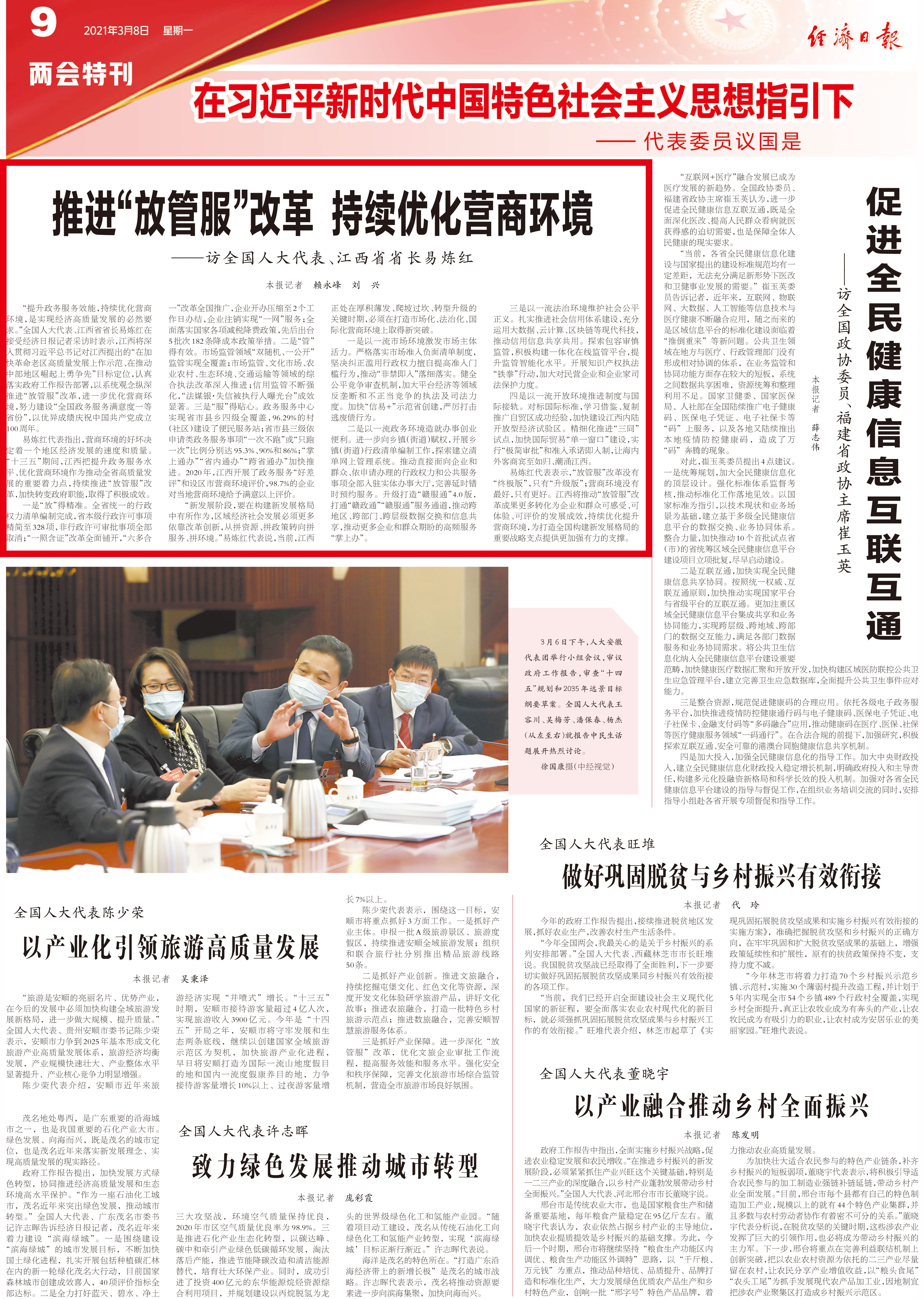 “提升政務(wù)服務(wù)效能,持續(xù)優(yōu)化營(yíng)商環(huán)境,是實(shí)現(xiàn)經(jīng)濟(jì)高質(zhì)量發(fā)展的必然要求?!比珖?guó)人大代表、江西省省長(zhǎng)易煉紅在接受經(jīng)濟(jì)日?qǐng)?bào)記者采訪時(shí)表示,江西將深入貫徹習(xí)近平總書記對(duì)江西提出的“在加快革命老區(qū)高質(zhì)量發(fā)展上作示范、在推動(dòng)中部地區(qū)崛起上勇爭(zhēng)先”目標(biāo)定位,認(rèn)真落實(shí)政府工作報(bào)告部署,以系統(tǒng)觀念縱深推進(jìn)“放管服”改革,進(jìn)一步優(yōu)化營(yíng)商環(huán)境,努力建設(shè)“全國(guó)政務(wù)服務(wù)滿意度一等省份”,以優(yōu)異成績(jī)慶祝中國(guó)共產(chǎn)黨成立100周年。易煉紅代表指出,營(yíng)商環(huán)境的好壞決定著一個(gè)地區(qū)經(jīng)濟(jì)發(fā)展的速度和質(zhì)量?!笆濉逼陂g,江西把提升政務(wù)服務(wù)水平、優(yōu)化營(yíng)商環(huán)境作為推動(dòng)全省高質(zhì)量發(fā)展的重要著力點(diǎn),持續(xù)推進(jìn)“放管服”改革,加快轉(zhuǎn)變政府職能,取得了積極成效。