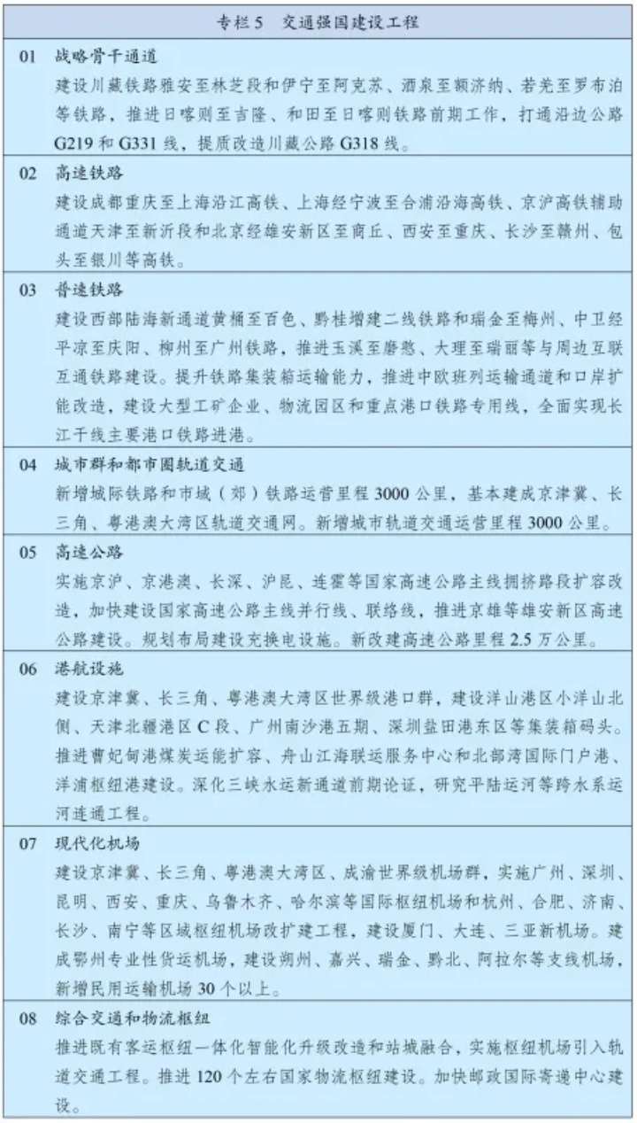 建設(shè)現(xiàn)代化綜合交通運輸體系,推進各種運輸方式一體化融合發(fā)展,提高網(wǎng)絡(luò)效應(yīng)和運營效率。完善綜合運輸大通道,加強出疆入藏、中西部地區(qū)、沿江沿海沿邊戰(zhàn)略骨干通道建設(shè),有序推進能力緊張通道升級擴容,加強與周邊國家互聯(lián)互通。構(gòu)建快速網(wǎng),基本貫通“八縱八橫”高速鐵路,提升國家高速公路網(wǎng)絡(luò)質(zhì)量,加快建設(shè)世界級港口群和機場群。完善干線網(wǎng),加快普速鐵路建設(shè)和既有鐵路電氣化改造,優(yōu)化鐵路客貨布局,推進普通國省道瓶頸路段貫通升級,推動內(nèi)河高等級航道擴能升級,穩(wěn)步建設(shè)支線機場、通用機場和貨運機場,積極發(fā)展通用航空。加強郵政設(shè)施建設(shè),實施快遞“進村進廠出?!惫こ?。推進城市群都市圈交通一體化,加快城際鐵路、市域(郊)鐵路建設(shè),構(gòu)建高速公路環(huán)線系統(tǒng),有序推進城市軌道交通發(fā)展。提高交通通達深度,推動區(qū)域性鐵路建設(shè),加快沿邊抵邊公路建設(shè),繼續(xù)推進“四好農(nóng)村路”建設(shè),完善道路安全設(shè)施。構(gòu)建多層級、一體化綜合交通樞紐體系,優(yōu)化樞紐場站布局、促進集約綜合開發(fā),完善集疏運系統(tǒng),發(fā)展旅客聯(lián)程運輸和貨物多式聯(lián)運,推廣全程“一站式”、“一單制”服務(wù)。推進中歐班列集結(jié)中心建設(shè)。深入推進鐵路企業(yè)改革,全面深化空管體制改革,推動公路收費制度和養(yǎng)護體制改革。