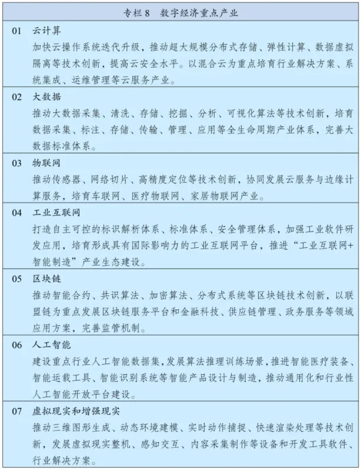 聚焦高端芯片、操作系統(tǒng)、人工智能關(guān)鍵算法、傳感器等關(guān)鍵領(lǐng)域,加快推進基礎(chǔ)理論、基礎(chǔ)算法、裝備材料等研發(fā)突破與迭代應(yīng)用。加強通用處理器、云計算系統(tǒng)和軟件核心技術(shù)一體化研發(fā)。加快布局量子計算、量子通信、神經(jīng)芯片、DNA存儲等前沿技術(shù),加強信息科學(xué)與生命科學(xué)、材料等基礎(chǔ)學(xué)科的交叉創(chuàng)新,支持?jǐn)?shù)字技術(shù)開源社區(qū)等創(chuàng)新聯(lián)合體發(fā)展,完善開源知識產(chǎn)權(quán)和法律體系,鼓勵企業(yè)開放軟件源代碼、硬件設(shè)計和應(yīng)用服務(wù)。