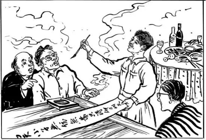 國(guó)民黨探知戴參謀是個(gè)地主家庭出身的知識(shí)分子,便挖空心思,軟硬兼施,妄想逼迫他叛變革命。于是布置圈套,設(shè)宴款待,由一個(gè)姓吳的軍官和幾個(gè)特殊賓客作陪。酒席上,幾個(gè)跳梁小丑賣弄風(fēng)雅,談古論今,題詩(shī)作對(duì),不斷勸說戴參謀投敵叛變,戴參謀只是端然而坐,對(duì)其不理不睬。酒過三巡,戴參謀仍然不為所動(dòng),吳姓軍官賊心不死,又想出一個(gè)詭計(jì),吩咐勤務(wù)兵拿來(lái)筆墨和一張大紅紙。他應(yīng)用拆字法肢解“戴”字,在紅紙的一邊寫了一句上聯(lián):“戴先生有田有土,何必操戈入共?”寫畢,嬉皮笑臉地向戴參謀求對(duì)。戴參謀識(shí)破敵人的詭計(jì),即以其人之道還治其人之身,在紅紙的另一邊迅速寫了一句下聯(lián):“吳小子無(wú)依無(wú)靠,只得仰口叫天。”聯(lián)語(yǔ)針鋒相對(duì),諷刺辛辣,弄得敵人瞠目結(jié)舌,自取其辱,只得悻悻散了席,從此打消了念頭。