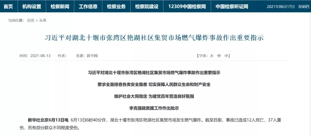 中共中央總書記、國家主席、中央軍委主席習(xí)近平立即作出重要指示,湖北十堰市燃?xì)獗ㄊ鹿试斐芍卮笕藛T傷亡,教訓(xùn)深刻!要全力搶救傷員,做好傷亡人員親屬安撫等善后工作,盡快查明原因,嚴(yán)肅追究責(zé)任。習(xí)近平強調(diào),近期全國多地發(fā)生生產(chǎn)安全事故、校園安全事件,各地區(qū)和有關(guān)部門要舉一反三、壓實責(zé)任,增強政治敏銳性,全面排查各類安全隱患,防范重大突發(fā)事件發(fā)生,切實保障人民群眾生命和財產(chǎn)安全,維護社會大局穩(wěn)定,為建黨百年營造良好氛圍。