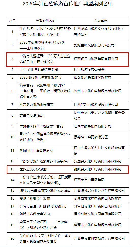 2020年江西省旅游宣傳推廣典型案例名單