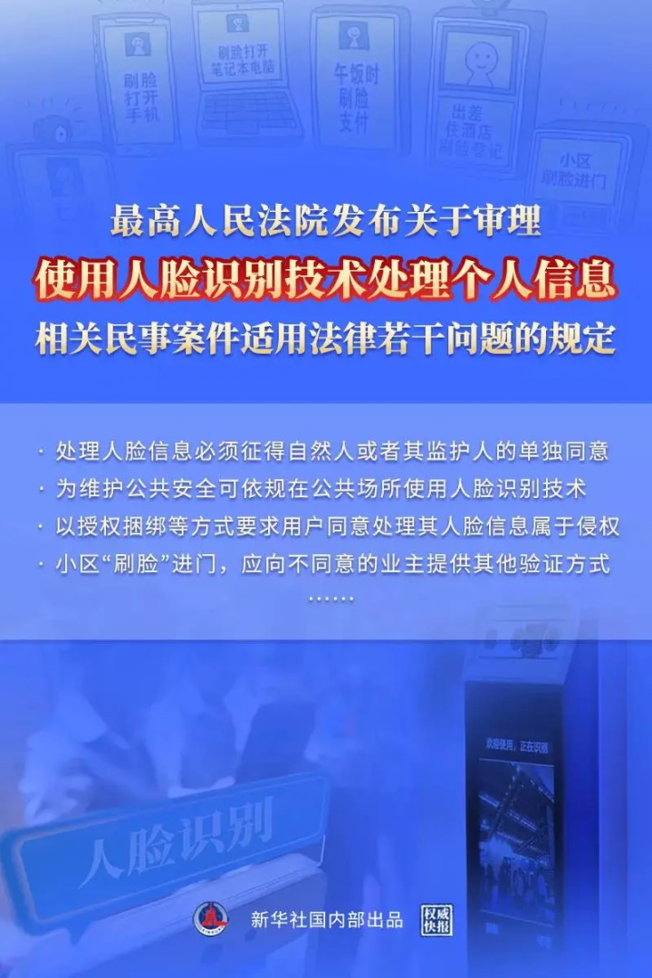 最高法有關(guān)負(fù)責(zé)人表示,小區(qū)物業(yè)強(qiáng)制“刷臉”的問(wèn)題,社會(huì)普遍關(guān)注。人臉信息屬于敏感個(gè)人信息,小區(qū)物業(yè)對(duì)人臉信息的采集、使用必須依法征得業(yè)主或者物業(yè)使用人的同意。只有業(yè)主或者物業(yè)使用人自愿同意使用人臉識(shí)別,對(duì)人臉信息的采集、使用才有了合法性基礎(chǔ)。