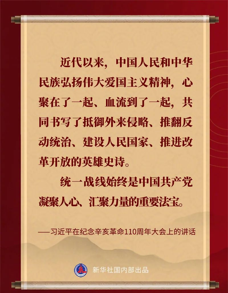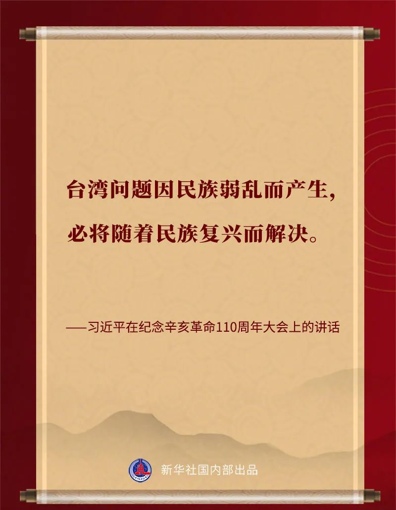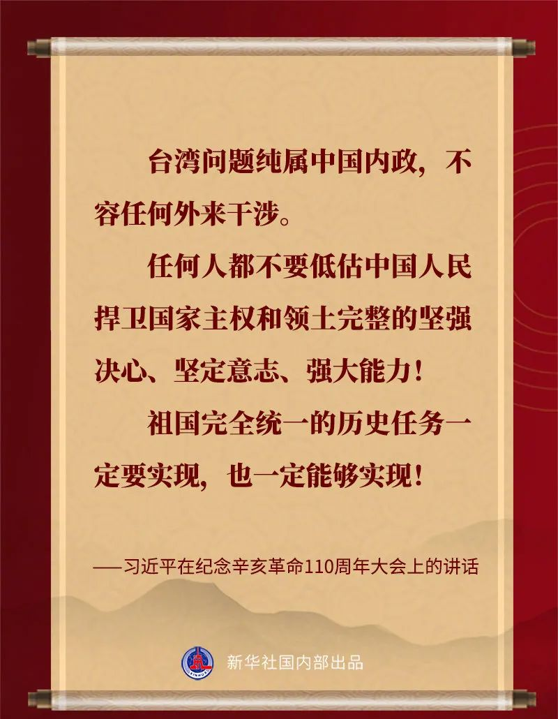 習近平說,中華民族具有反對分裂、維護統(tǒng)一的光榮傳統(tǒng)。“臺獨”分裂是祖國統(tǒng)一的最大障礙,是民族復興的嚴重隱患。凡是數(shù)典忘祖、背叛祖國、分裂國家的人,從來沒有好下場,必將遭到人民的唾棄和歷史的審判!臺灣問題純屬中國內(nèi)政,不容任何外來干涉。任何人都不要低估中國人民捍衛(wèi)國家主權(quán)和領(lǐng)土完整的堅強決心、堅定意志、強大能力!祖國完全統(tǒng)一的歷史任務一定要實現(xiàn),也一定能夠?qū)崿F(xiàn)!