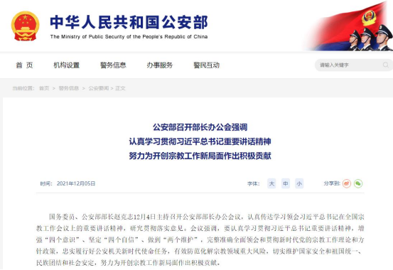 國務(wù)委員、公安部部長趙克志12月4日主持召開公安部部長辦公會議,認(rèn)真?zhèn)鬟_(dá)學(xué)習(xí)領(lǐng)會習(xí)近平總書記在全國宗教工作會議上的重要講話精神,研究貫徹落實意見。會議強調(diào),要認(rèn)真學(xué)習(xí)貫徹習(xí)近平總書記重要講話精神,增強“四個意識”、堅定“四個自信”、做到“兩個維護(hù)”,完整準(zhǔn)確全面領(lǐng)會和貫徹新時代黨的宗教工作理論和方針政策,忠實履行好公安機關(guān)新時代使命任務(wù),有效防范化解宗教領(lǐng)域重大風(fēng)險,切實維護(hù)國家安全和祖國統(tǒng)一、民族團結(jié)和社會安定,努力為開創(chuàng)宗教工作新局面作出積極貢獻(xiàn)。