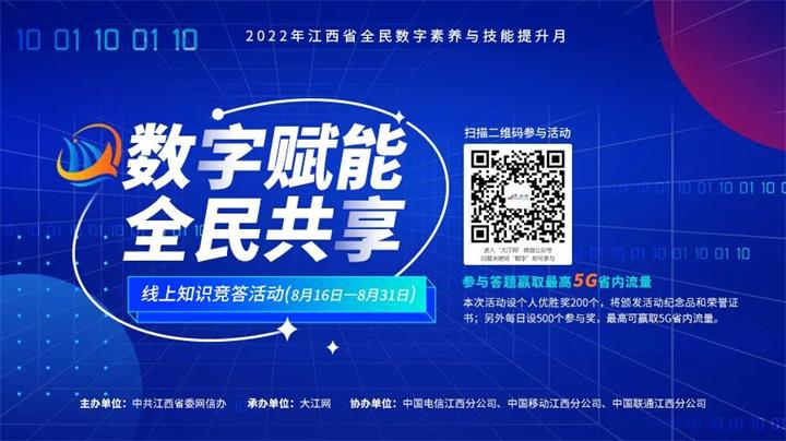 本次活動由大江網(wǎng)承辦,三大運營商提供支持,參與即有機會抽取最高5G的省內(nèi)流量?;顒咏刂箷r間8月31日,歡迎社會各界及廣大網(wǎng)民廣泛關(guān)注、積極參與!