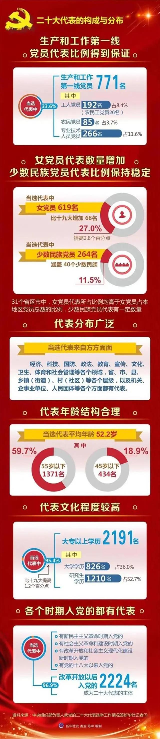 二十大代表應具有廣泛代表性,能夠代表和反映各行各業(yè)、各個方面的黨員意愿。結構合理、廣泛分布,是代表具有廣泛代表性的重要體現。包括要保證生產和工作第一線代表比例;注重推薦工人、農民和專業(yè)技術人員黨員中的先進模范人物;女黨員和少數民族黨員應占一定比例;嚴把人選身份關,防止扣帽子。